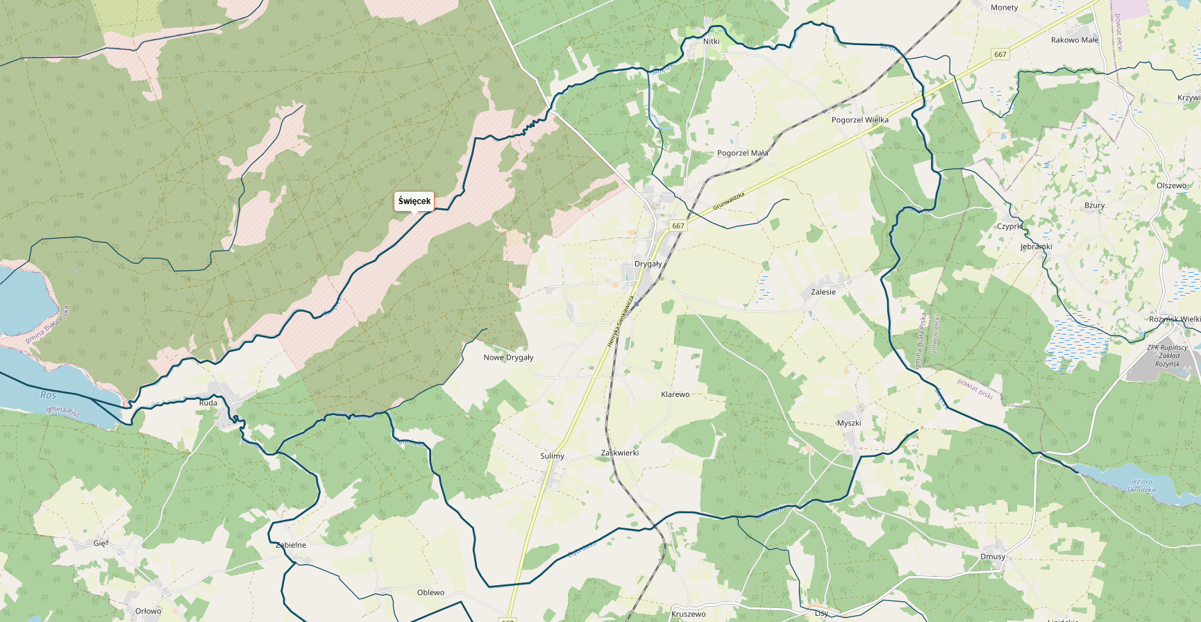 Rzeka znajduje się w zlewni rzeki Pisy. Przepływa przez tereny w